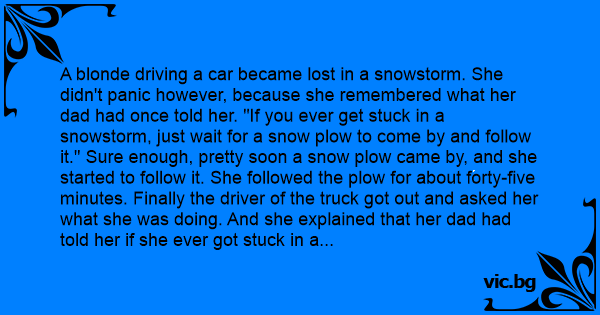 A blonde driving a car became lost in a snowstorm. She didn't panic however, because she remembered what her dad had once told her. "If you ever get stuck in a snowstorm, just wait for a snow plow to come by and follow it." Sure enough, pretty soon a snow plow came by, and she started to follow it. She followed the plow for about forty-five minutes. Finally the driver of the truck got out and asked her what she was doing. And she explained that her dad had told her if she ever got stuck in a snow storm, to follow a plow.