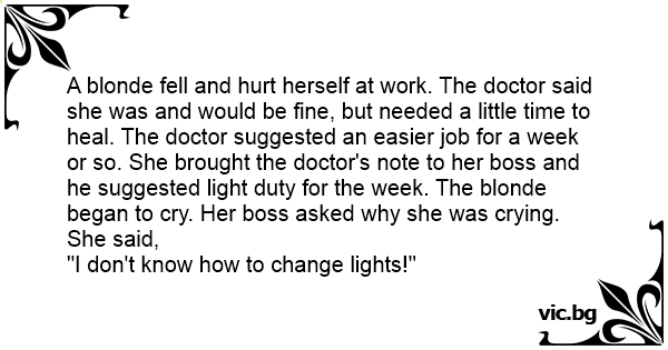 A blonde fell and hurt herself at work. The doctor said she was and would be fine, but needed a little time to heal. The doctor suggested an easier job for a week or so. She brought the doctor's note to her boss and he suggested light duty for the week. The blonde began to cry. Her boss asked why she was crying. She said,