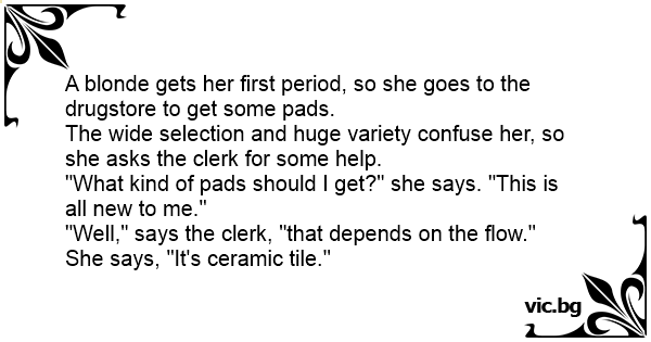 A blonde gets her first period, so she goes to the drugstore to get some pads.