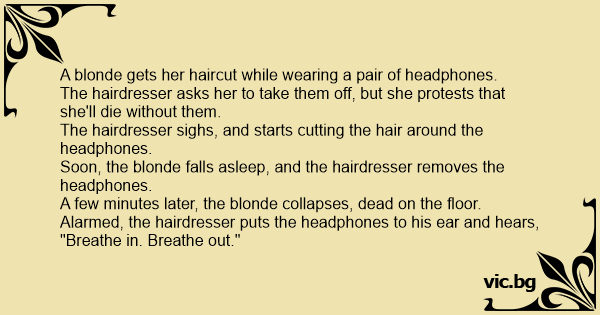 En blondin skulle gå och klippa sig, när hon kom in i salongen så hade hon hörlurar på sig och blondinen sa till frisören att hon inte fick ta av hörlurarna. Frisören började klippa runt hörlurarna...