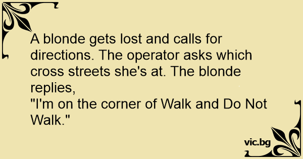 A blonde gets lost and calls for directions. The operator asks which cross streets she's at. The blonde replies,