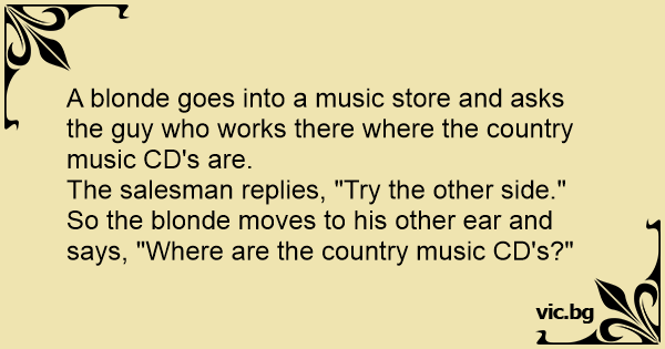 So the blonde moves to his other ear and says, "Where are the country music CD's?"