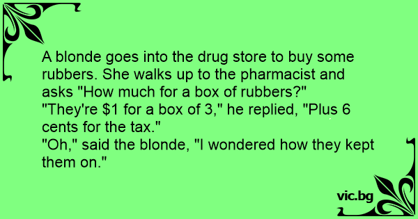 A blonde goes into the drug store to buy some rubbers. She walks up to the pharmacist and asks "How much for a box of rubbers?"