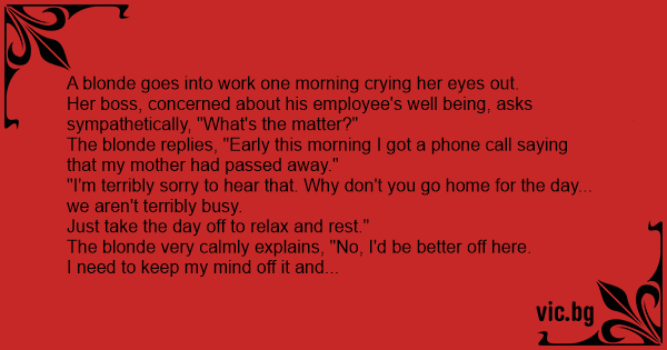 Blondinen kommer gråtende på jobb. Sjefen spør: - «Hva har skjedd?» «Moren min har dødd», svarer blondinen. Sjefen ber henne gå hjem, men hun sier det går greit. Senere på dagen finner sjefen henne...