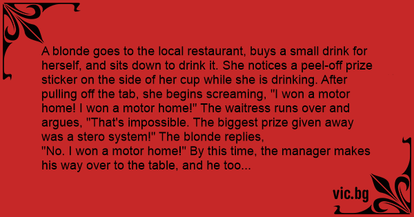 A blonde goes to the local restaurant, buys a small drink for herself, and sits down to drink it. She notices a peel-off prize sticker on the side of her cup while she is drinking. After pulling off the tab, she begins screaming, "I won a motor home! I won a motor home!" The waitress runs over and argues, "That's impossible. The biggest prize given away was a stero system!" The blonde replies,