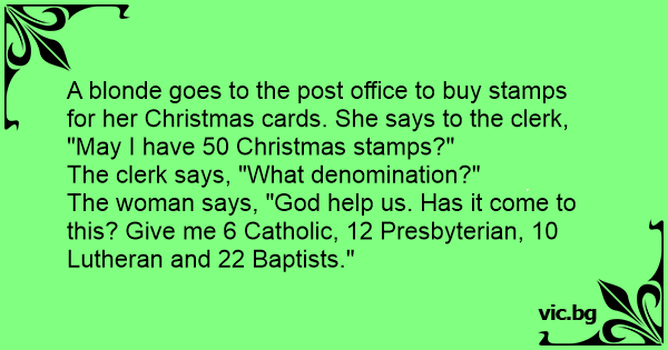 A blonde goes to the post office to buy stamps for her Christmas cards. She says to the clerk, "May I have 50 Christmas stamps?"