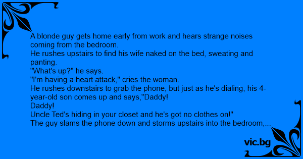 Un tipo llega a su casa inesperadamente y encuentra a su mujer en la cama, desnuda y Sudorosa.. - Mujer, ¿qué te pasa? - Tengo un ataque al corazón, dice ella con voz entrecortada. - Quédate...