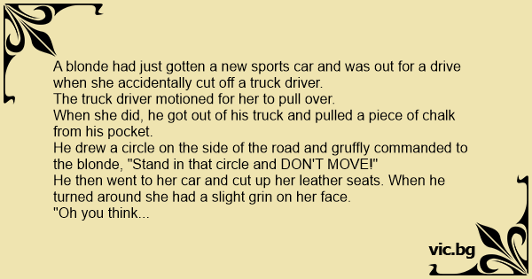 A blonde had just gotten a new sports car and was out for a drive when she accidentally cut off a truck driver.