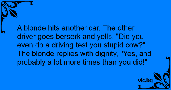 A blonde hits another car. The other driver goes berserk and yells, "Did you even do a driving test you sтuрid соw?"
