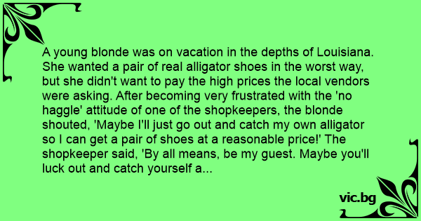 A young blonde was on vacation in the depths of Louisiana. She wanted a pair of real alligator shoes in the worst way, but she didn't want to pay the high prices the local vendors were asking. After becoming very frustrated with the 'no haggle' attitude of one of the shopkeepers, the blonde shouted, 'Maybe I'll just go out and catch my own alligator so I can get a pair of shoes at a reasonable price!' The shopkeeper said, 'By all means, be my guest. Maybe you'll luck out and catch yourself a big one!' Determined, the blonde turned and headed for the swamps, set on catching herself an alligator. Later in the day, the shopkeeper is driving home, when he spots the young woman standing waist-deep in the water, shotgun in hand. Just then, he sees a huge 9-foot alligator swimming quickly toward her. She takes aim, kills the creature and with a great deal of effort hauls it on to the swamp bank. Lying nearby were several more of the dead creatures. The shopkeeper watches in amazement. Just then the blonde flips the alligator on its back, and frustrated, shouts out, 'Dаrn, this one isn't wearing any shoes either!'