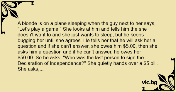 "Let's play a game." She looks at him and tells him the she doesn't want to and she just wants to sleep, but he keeps bugging her until she agrees. He tells her that he will ask her a question and if she can't answer, she owes him $5.00, then she asks him a question and if he can't answer, he owes her $50.00. So he asks, "Who was the last person to sign the Declaration of Independence?" She quietly hands over a $5 bill. She asks, "What goes up a hill with 4 legs and down with 5? He has no idea so he gives up and gives her $50. The blonde turns back around and goes back to sleep. Not 2 seconds later, he wakes her back up and asks, "What was the answer?" Quietly, she reaches into her purse and gives the guy a $5.00 bill.