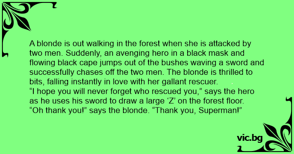 A blonde is out walking in the forest when she is attacked by two men. Suddenly, an avenging hero in a black mask and flowing black cape jumps out of the bushes waving a sword and successfully chases off the two men. The blonde is thrilled to bits, falling instantly in love with her gallant rescuer.