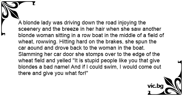A blonde lady was driving down the road injoying the sceenery and the breeze in her hair when she saw another blonde woman sitting in a row boat in the middle of a field of wheat, rowwing. Hitting hard on the brakes, she spun the car aound and drove back to the woman in the boat. Slamming her car door she stomps over to the edge of the wheat field and yelled "It is sтuрid people like you that give blondes a bad name! And if I could swim, I would come out there and give you what for!"