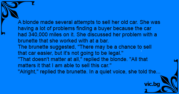 A blonde made several attempts to sell her old car. She was having a lot of problems finding a buyer because the car had 340,000 miles on it. She discussed her problem with a brunette that she worked with at a bar.