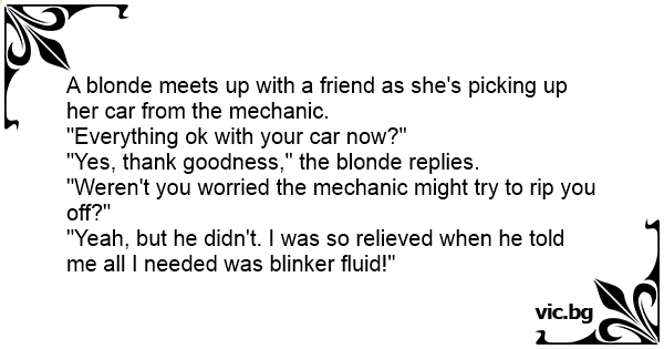 "Yeah, but he didn't. I was so relieved when he told me all I needed was blinker fluid!"