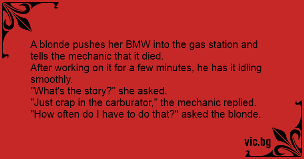 A blonde pushes her BMW into the gas station and tells the mechanic that it died.