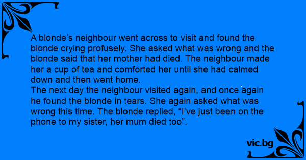 The next day the neighbour visited again, and once again he found the blonde in tears. She again asked what was wrong this time. The blonde replied, “I’ve just been on the phone to my sister, her mum died too”.