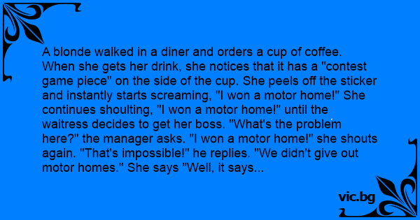 A blonde walked in a diner and orders a cup of coffee. When she gets her drink, she notices that it has a "contest game piece" on the side of the cup. She peels off the sticker and instantly starts screaming, "I won a motor home!" She continues shoulting, "I won a motor home!" until the waitress decides to get her boss. "What's the problem here?" the manager asks. "I won a motor home!" she shouts again. "That's impossible!" he replies. "We didn't give out motor homes." She says "Well, it says so on this sticker." The boss takes the sticker and reads it. It says: