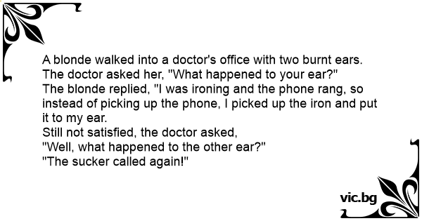 Egy szőke nő bemegy az orvoshoz, mert mindkét füle égőpiros. Kérdi tőle az orvos, hogy mi történt? - Éppen vasaltam, amikor megszólalt a telefon, és tévedésből a vasalót szorítottam a fülemhez -...