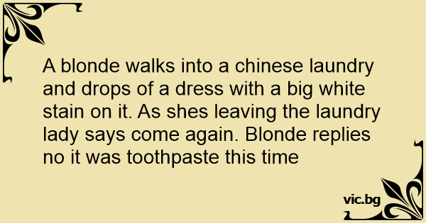 A blonde walks into a chinese laundry and drops of a dress with a big white stain on it. As shes leaving the laundry lady says come again. Blonde replies no it was toothpaste this time
