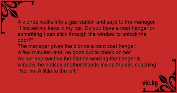 Блондинка на бензиностанция. Зарежда колата, отива, плаща, връща се, и... Класическа ситуация - ключът вътре, колата заключена...