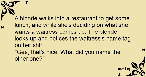 A blonde walks into a restaurant to get some lunch, and while she's deciding on what she wants a waitress comes up. The blonde looks up and notices the waitress's name tag on her shirt...
