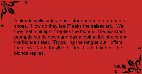 A blonde walks into a shoe store and tries on a pair of shoes. "How do they feel?" asks the salesclerk. "Well, they feel a bit tight," replies the blonde. The assistant promptly bends down and has a look at the shoes and the blonde’s feet. "Try pulling the tongue out," offers the clerk. “Nath, theyth sthill feelth a bith tighth,” the blonde replies.