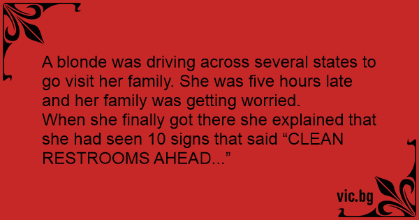 When she finally got there she explained that she had seen 10 signs that said “CLEAN RESTROOMS AHEAD...”