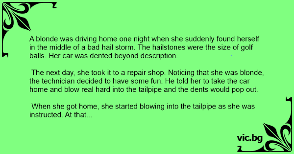 A blonde was driving home one night when she suddenly found herself in the middle of a bad hail storm. The hailstones were the size of golf ваlls. Her car was dented beyond description.