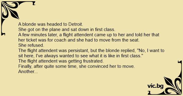 There was once a blonde woman on a plane to Detroit. She was in the economy class, but after takeoff, she saw an empty seat in first class and moved there. An attendant saw her and said, "Excuse...
