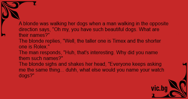 A blonde was walking her dogs when a man walking in the opposite direction says, "Oh my, you have such beautiful dogs. What are their names?"