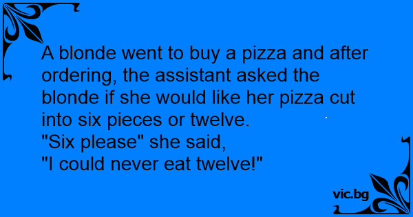 A blonde went to buy a pizza and after ordering, the assistant asked the blonde if she would like her pizza cut into six pieces or twelve.