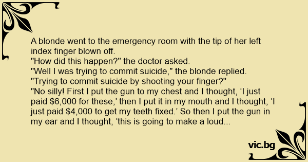 "No silly! First I put the gun to my chest and I thought, ‘I just paid $6,000 for these,’ then I put it in my mouth and I thought, ‘I just paid $4,000 to get my teeth fixed.’ So then I put the gun in my ear and I thought, ‘this is going to make a loud noise,’ so I put my finger in my ear before I pulled the trigger.”