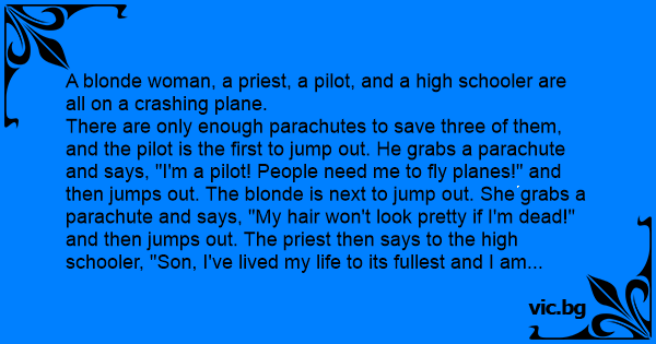 There are only enough parachutes to save three of them, and the pilot is the first to jump out. He grabs a parachute and says, "I'm a pilot! People need me to fly planes!" and then jumps out. The blonde is next to jump out. She grabs a parachute and says, "My hair won't look pretty if I'm dead!" and then jumps out. The priest then says to the high schooler, "Son, I've lived my life to its fullest and I am surely ready to join God in heaven." The high schooler then hands a parachute to the priest and puts another parachute on himself. The priest is shocked and asks the high schooler, "Oh Lord! Where did you find this extra parachute?" The high schooler replies, "The blonde lady took my backpack!"
