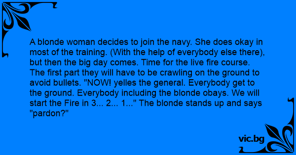 A blonde woman decides to join the navy. She does okay in most of the training. (With the help of everybody else there), but then the big day comes. Time for the live fire course.