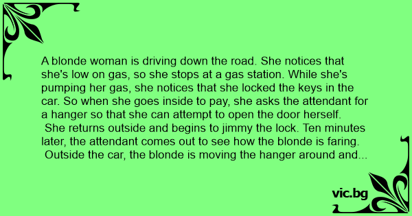 A blonde woman is driving down the road. She notices that she's low on gas, so she stops at a gas station. While she's pumping her gas, she notices that she locked the keys in the car. So when she goes inside to pay, she asks the attendant for a hanger so that she can attempt to open the door herself.