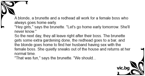 So the next day, they all leave right after their boss. The brunette gets some extra gardening done, the redhead goes to a bar, and the blonde goes home to find her husband having sеx with the female boss. She quietly sneaks out of the house and returns at her normal time.