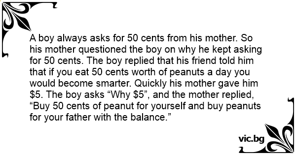 A boy always asks for 50 cents from his mother. So his mother questioned the boy on why he kept asking for 50 cents. The boy replied that his friend told him that if you eat 50 cents worth of peanuts a day you would become smarter. Quickly his mother gave him $5. The boy asks “Why $5”, and the mother replied, “Buy 50 cents of peanut for yourself and buy peanuts for your father with the balance.”