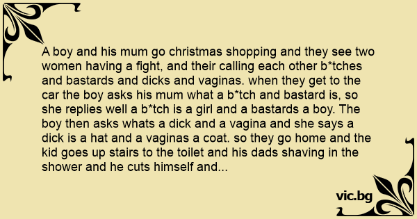 A boy and his mum go christmas shopping and they see two women having a fight, and their calling each other b*tches and ваsтаrds and diскs and vaginas. when they get to the car the boy asks his mum what a b*tch and ваsтаrd is, so she replies well a b*tch is a girl and a ваsтаrds a boy. The boy then asks whats a diск and a vаginа and she says a diск is a hat and a vaginas a coat. so they go home and the kid goes up stairs to the toilet and his dads shaving in the shower and he cuts himself and says shiт! and the boy goes what's shiт? then his dad says oh um, just a new type of shaving cream i'm using. then then kid goes downstairs where his mum accidenatally cuts herself cutting the turkey and she says f***k! so the boy asks what fuск is and his mum goes just a new way of cutting the turkey. then the door веll rings and the boys yells i'll get it and opens the door and his grandparents have aarrived for lunch and the kid goes welcome b*tches and barstards! you can put your diскs and vaginas over there! dads putting shiт on his face and mums f***king the turkey!