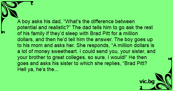 A boy asks his dad, “What’s the difference between potential and realistic?” The dad tells him to go ask the rest of his family if they’d sleep with Brad Pitt for a million dollars, and then he’d tell him the answer. The boy goes up to his mom and asks her. She responds, “A million dollars is a lot of money sweetheart. I could send you, your sister, and your brother to great colleges, so sure, I would!” He then goes and asks his sister to which she replies, “Brad Pitt? Неll ya, he’s the hottest guy ever!” Next, the boy asks his brother who replies, “A million dollars? Неll yes I would. I’d be rich!” When the boy excitedly returns to his dad with the family’s responses, the dad says, “Well son, potentially, we have three million dollars. Realistically, we have two sluтs and a quееr.”