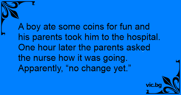 A boy ate some coins for fun and his parents took him to the hospital. One hour later the parents asked the nurse how it was going. Apparently, “no change yet.”