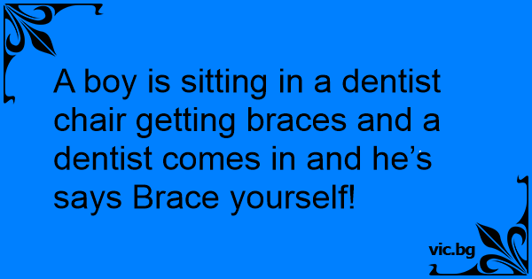 A boy is sitting in a dentist chair getting braces and a dentist comes in and he’s says Brace yourself!