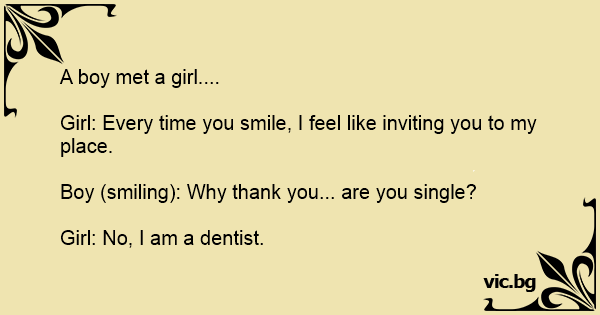 A guy is talking to a girl A guy is talking to a girl : "Everytime I see your smile, I want to take you to my place" "Oh ! You think I'm pretty ?" "No, I'm a dentist."
