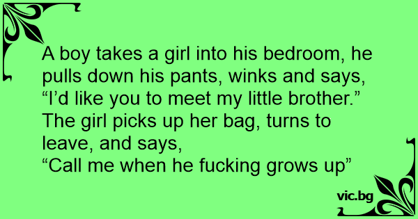 A boy takes a girl into his bedroom, he pulls down his pants, winks and says,