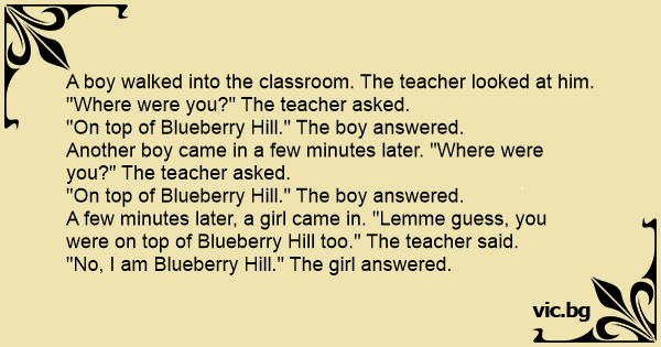 A few minutes later, a girl came in. "Lemme guess, you were on top of Blueberry Hill too." The teacher said.