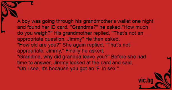 A boy was going through his grandmother's wallet one night and found her ID card. "Grandma?" he asked,"How much do you weigh?" His grandmother replied, "That's not an appropriate question, Jimmy" He then asked,