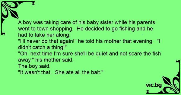 A boy was taking care of his baby sister while his parents went to town shopping. He decided to go fishing and he had to take her along.