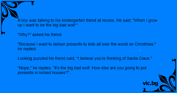 A boy was talking to his kindergarten friend at recess. He said, "When I grow up I want to be the big bad wolf."