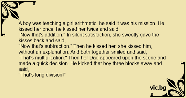 "That's multiplication." Then her Dad appeared upon the scene and made a quick decision. He kicked that boy three blocks away and said,