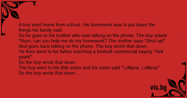 So he goes to his mother who was talking on the phone. The boy asked "Mum, can you help me do my homework? The mother says "Shut up!" And goes back talking on the phone. The boy wrote that down.